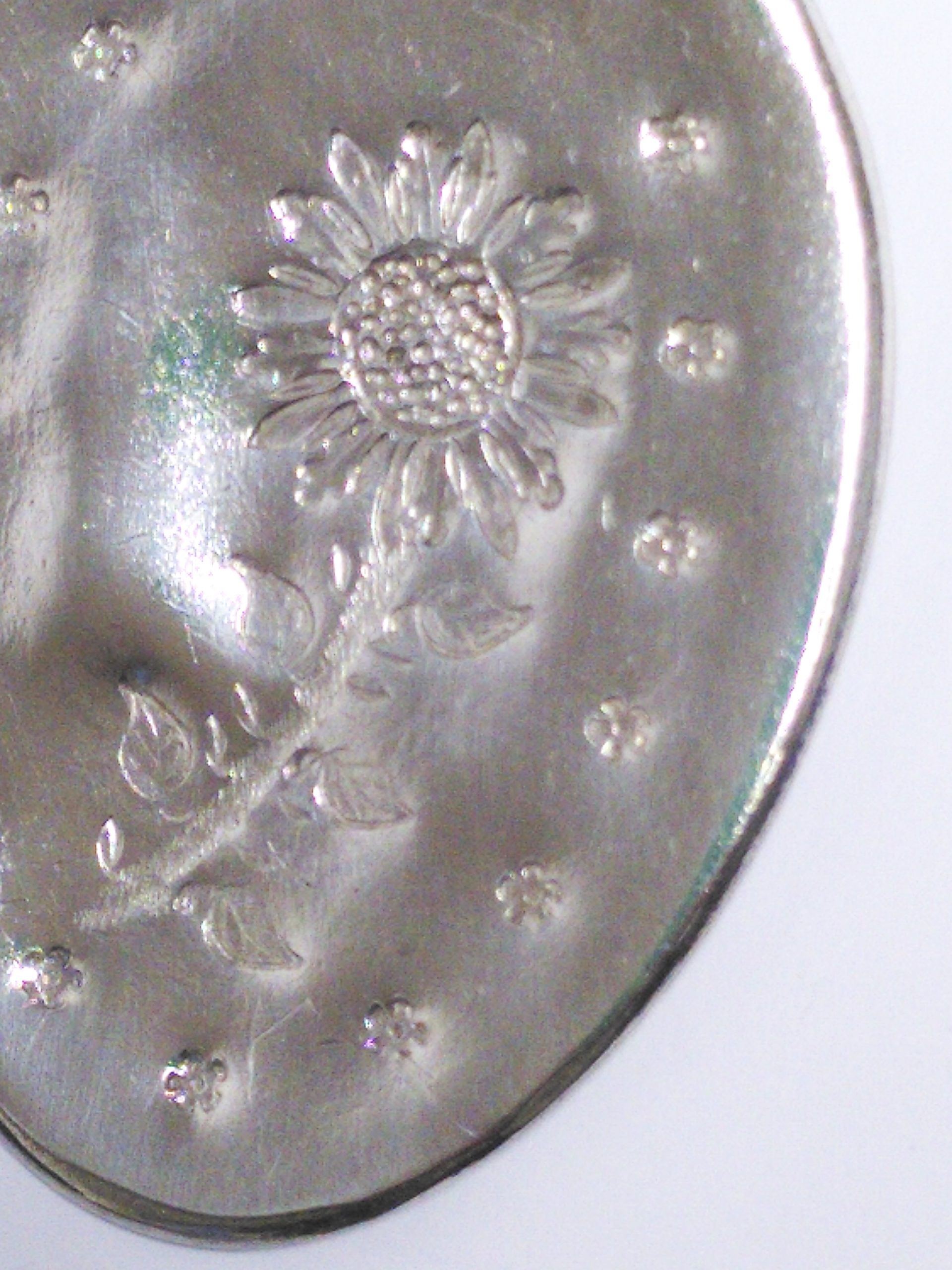 Die Löffelschale ist wunderschön mit Blumen verziert und macht diesen Löffelschmuck zu einem ganz besonderen Schmuckstück.