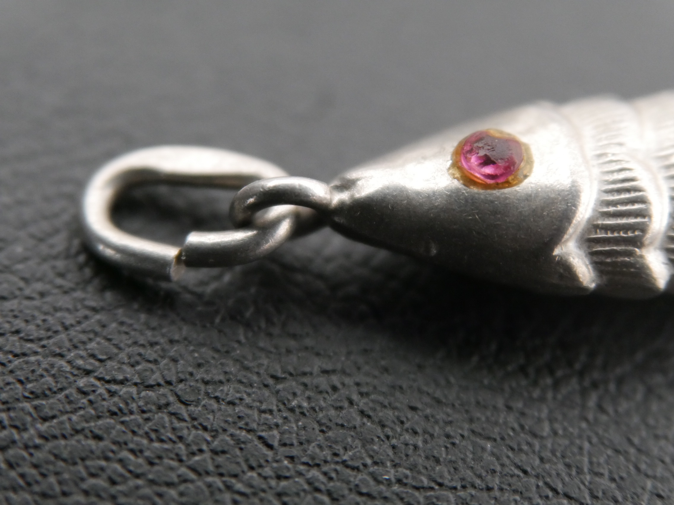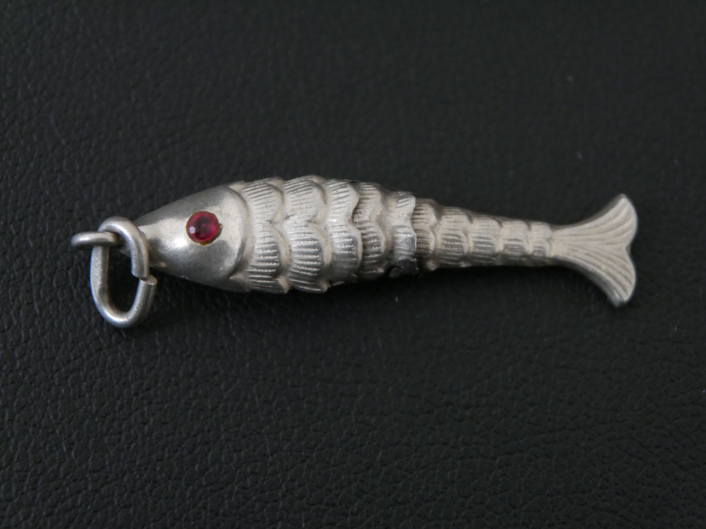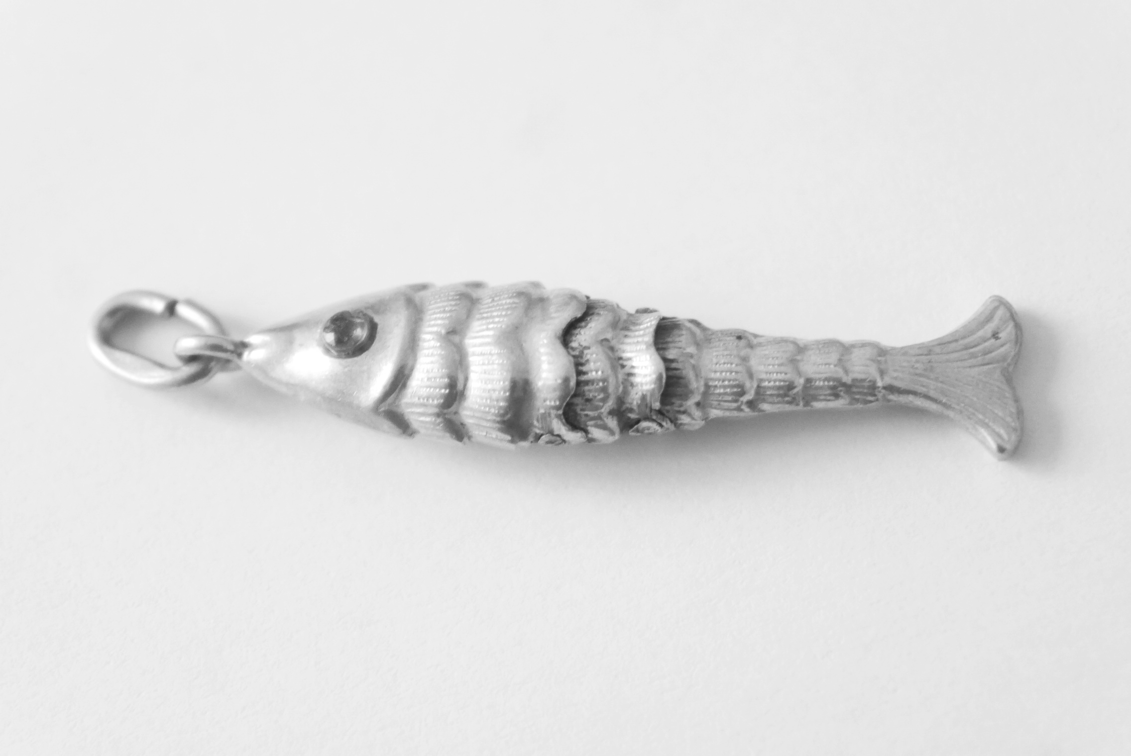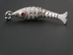 Dieser bewegliche Fisch Anhänger ist aus Silber.