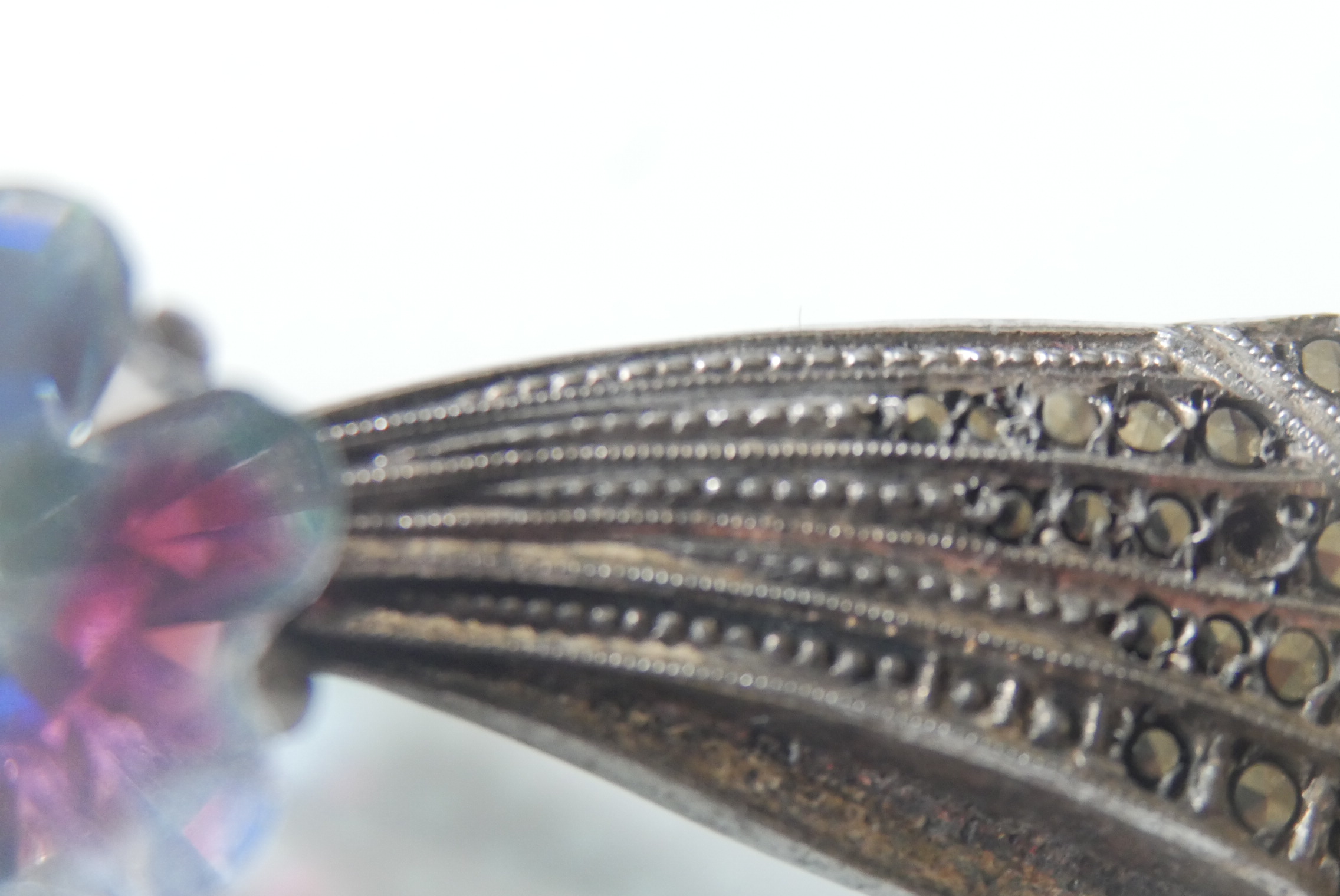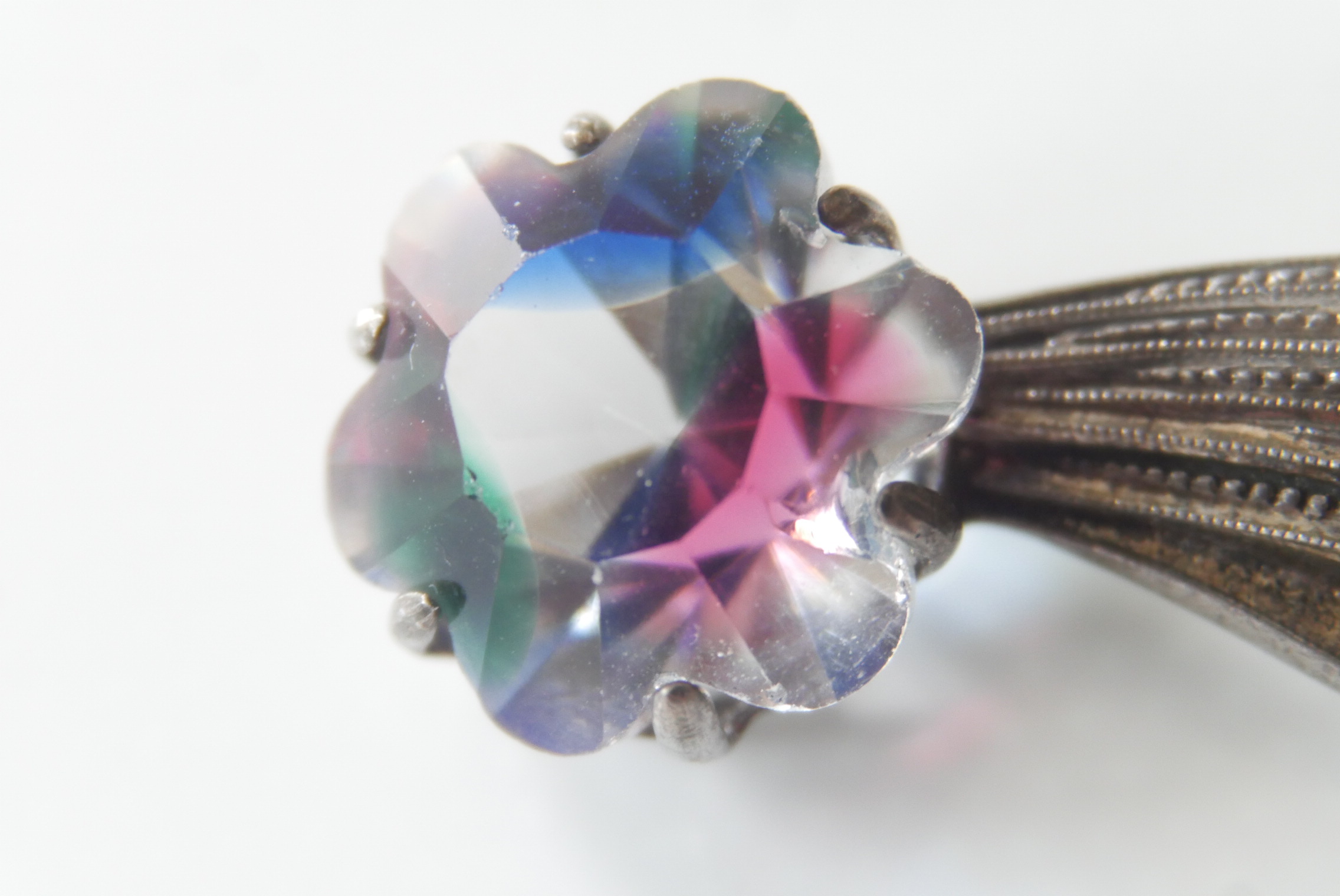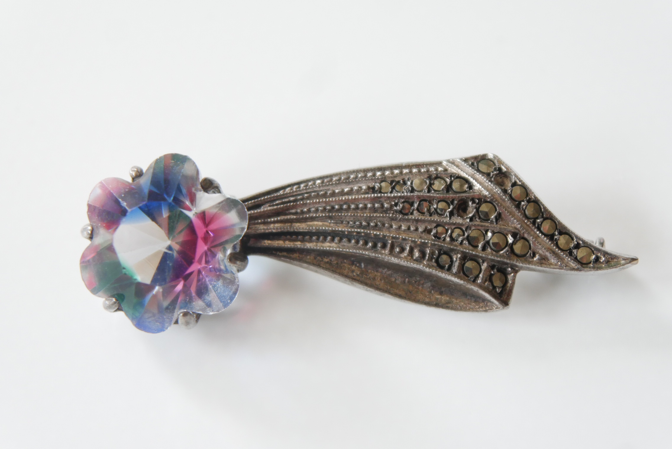 Eine wunderschöne Vintage Second-Hand Brosche aus Silber mit einer geschliffenen in Regenbogenfarben leuchtende Glas o.ä. als Blüte nachempfunden und filligraner Markasiten Besatz ohne Punze.