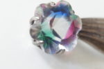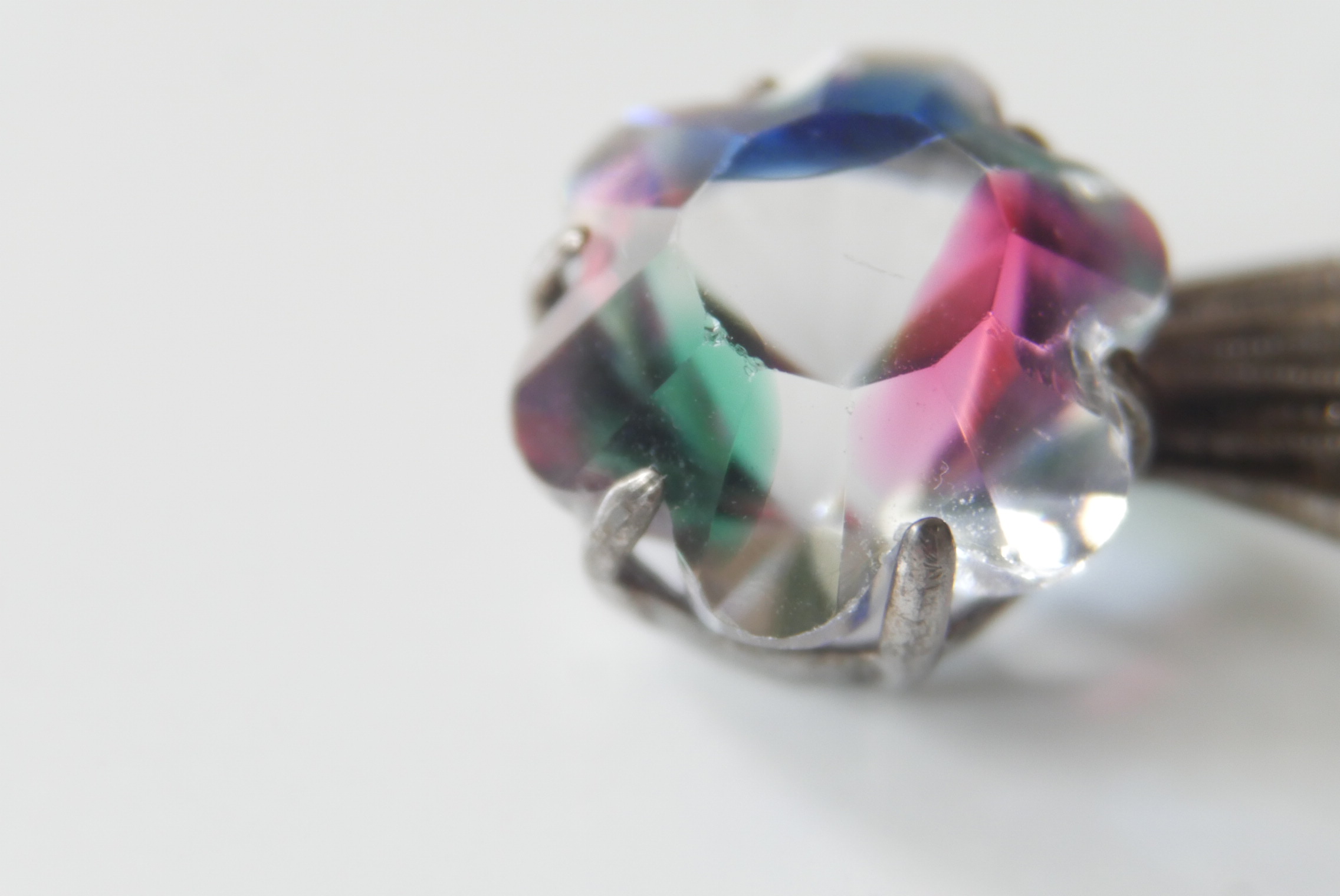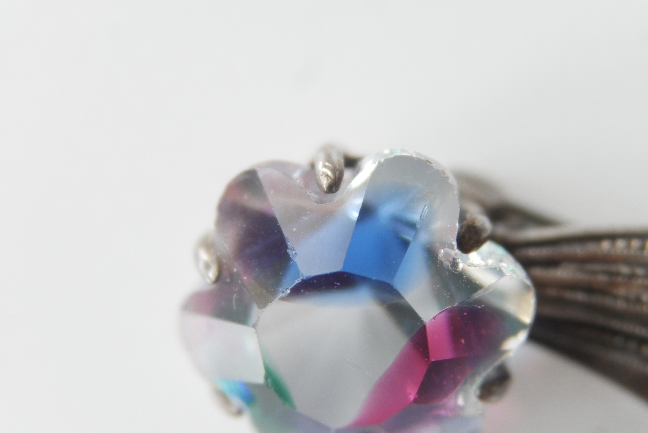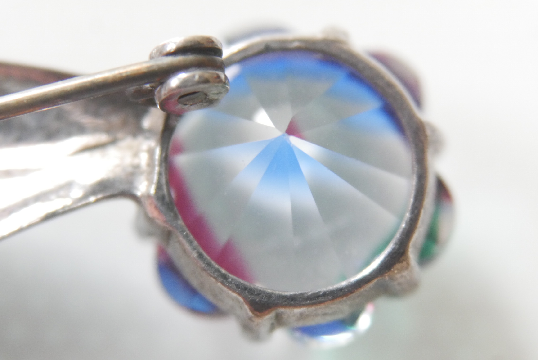 Eine wunderschöne Vintage Second-Hand Brosche aus Silber mit einer geschliffenen in Regenbogenfarben leuchtende Glas o.ä. als Blüte nachempfunden und filligraner Markasiten Besatz ohne Punze.