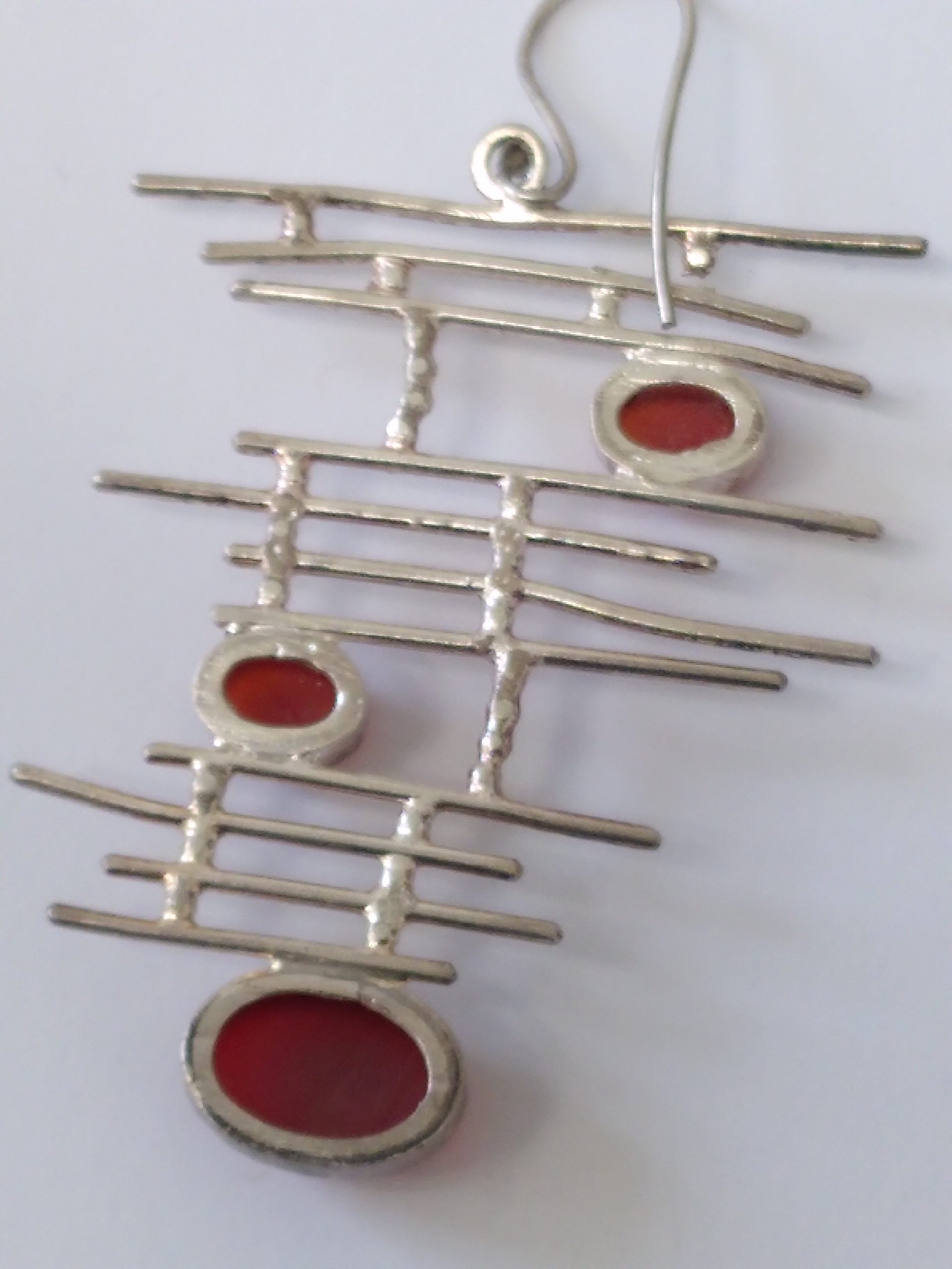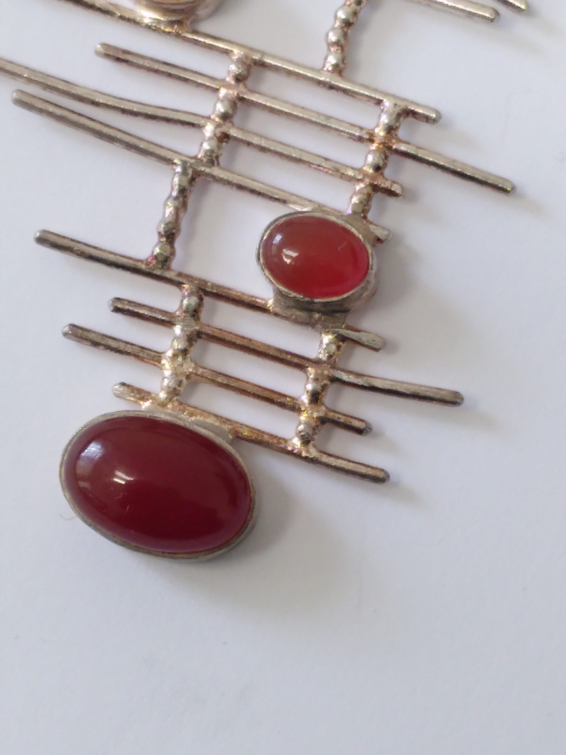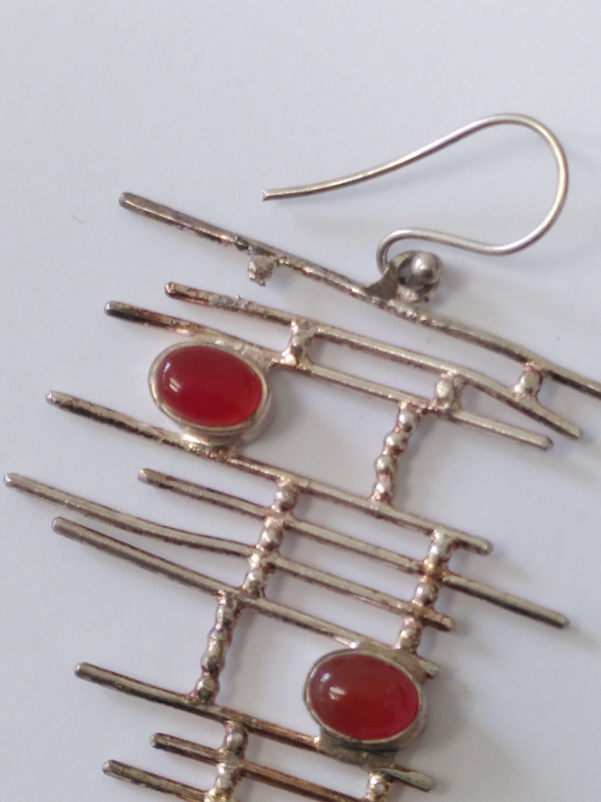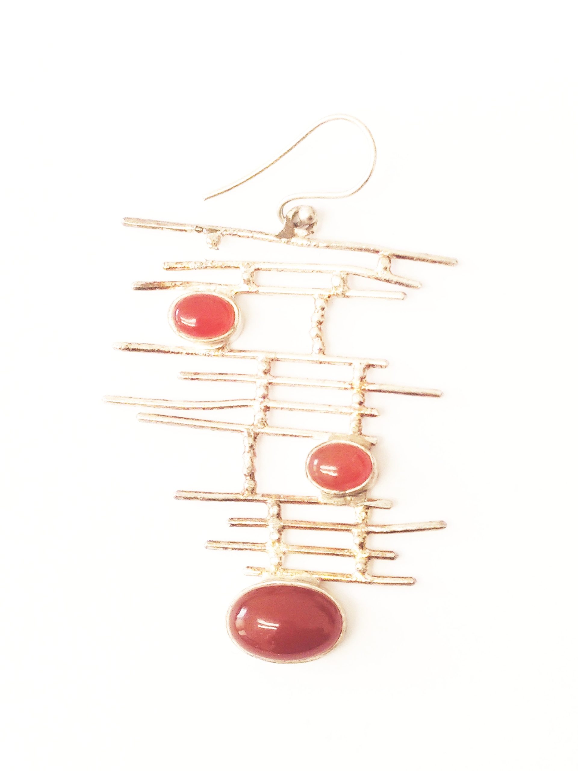 Dieser schöne Ohrhänger mit drei Carneol Steinen in einem Silberdrahtgerüst sind ein herrliches Schmuckstück für Ihr individuelles Auftreten.