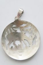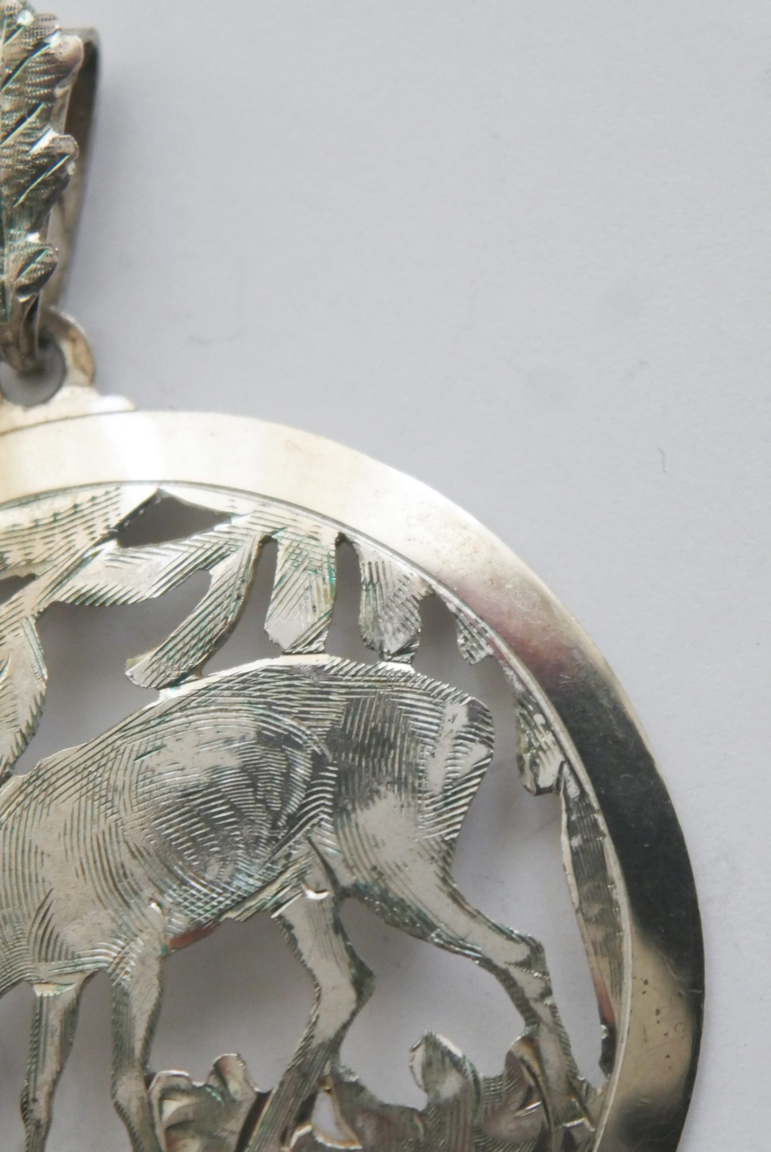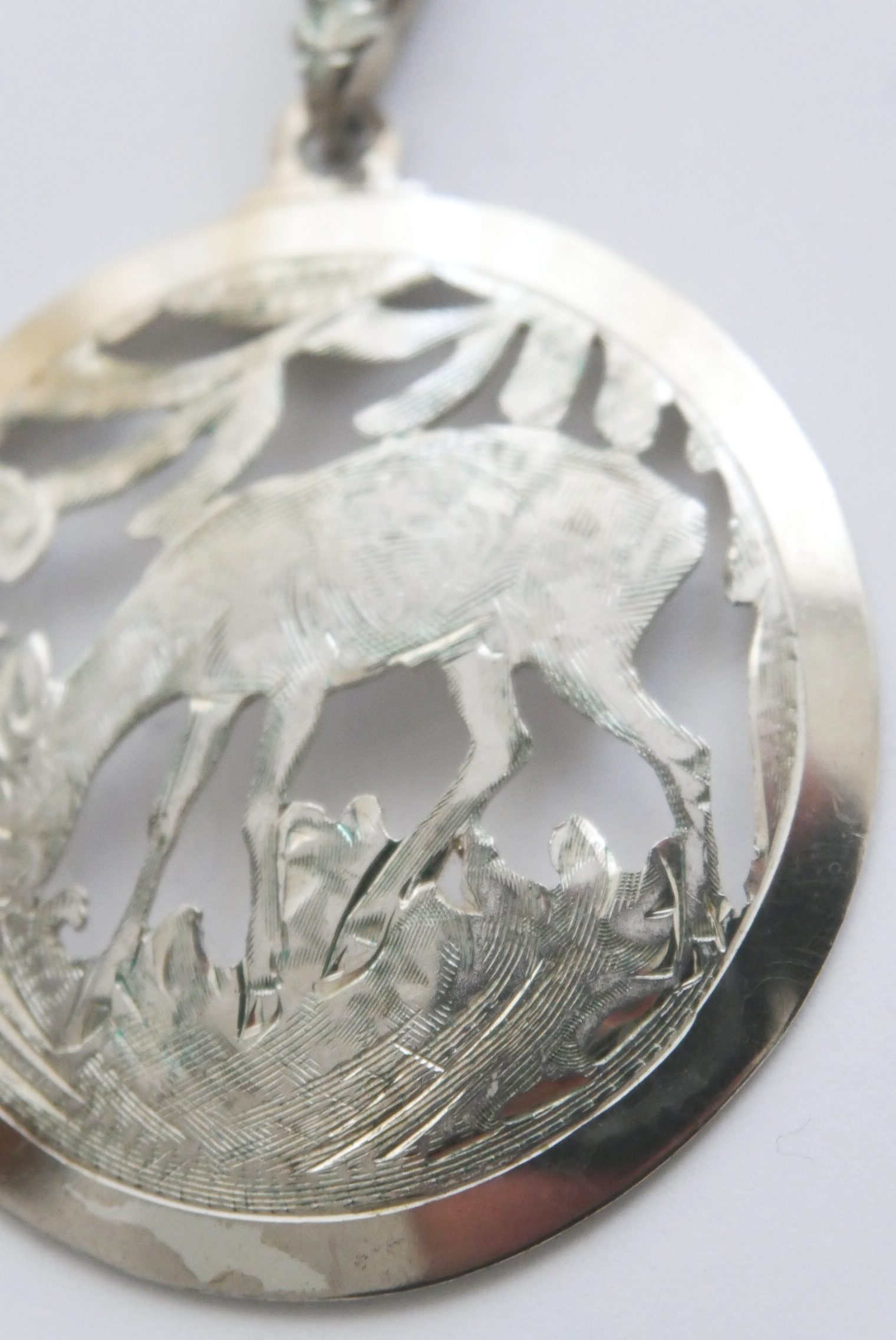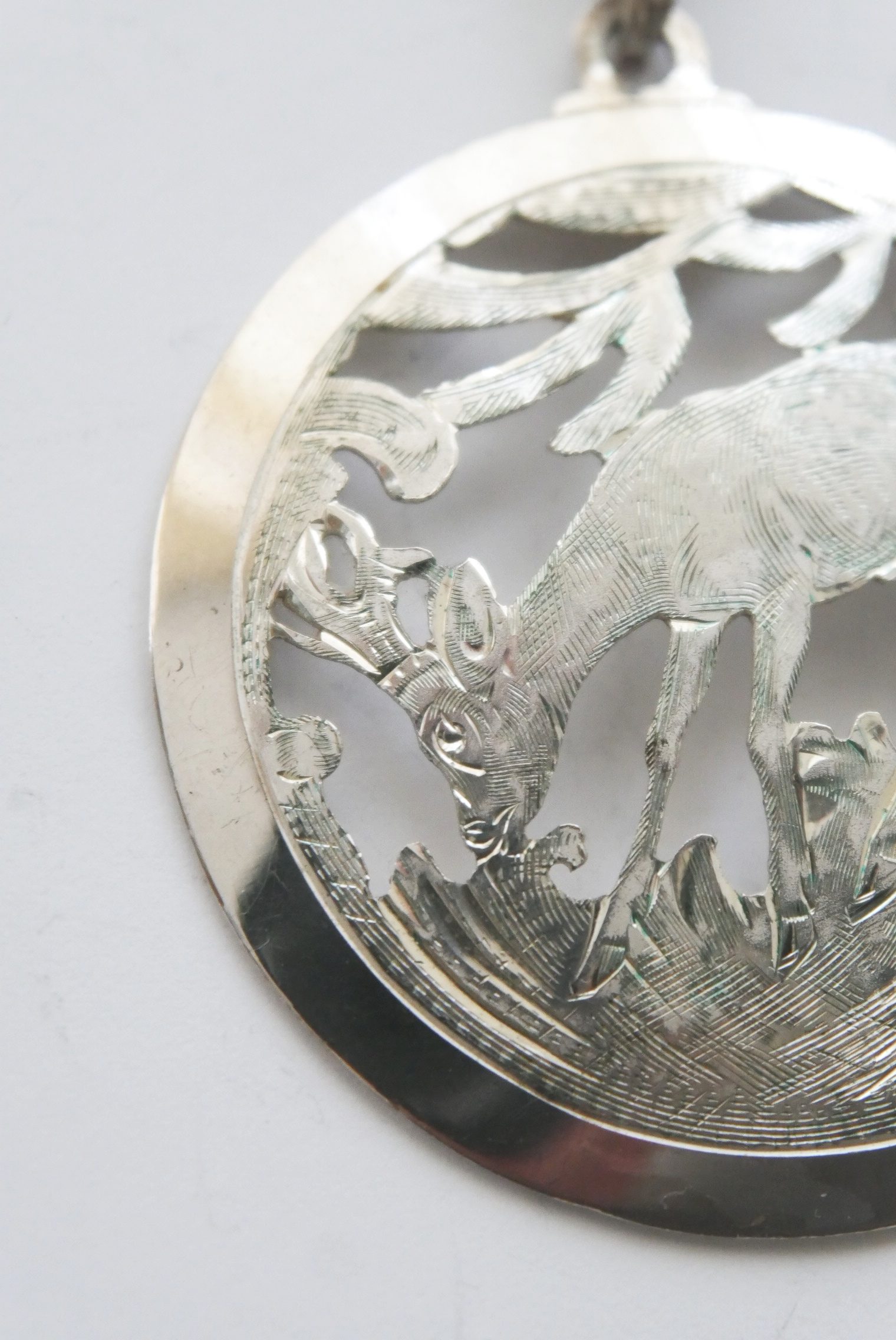 Ein wunderschöner Anhänger in Handarbeit gefertigt und mit Motiv ein äsendes Reh ausgeschnitten und graviert mit einer Eichlaub Öse und einer Punze Handarbeit 900.