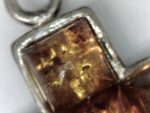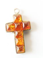 Ein kleiner christliches Kreuz Anhänger aus Silber in schlichter Form mit Stücken aus vermutlich braunen Bernstein besetzt.
