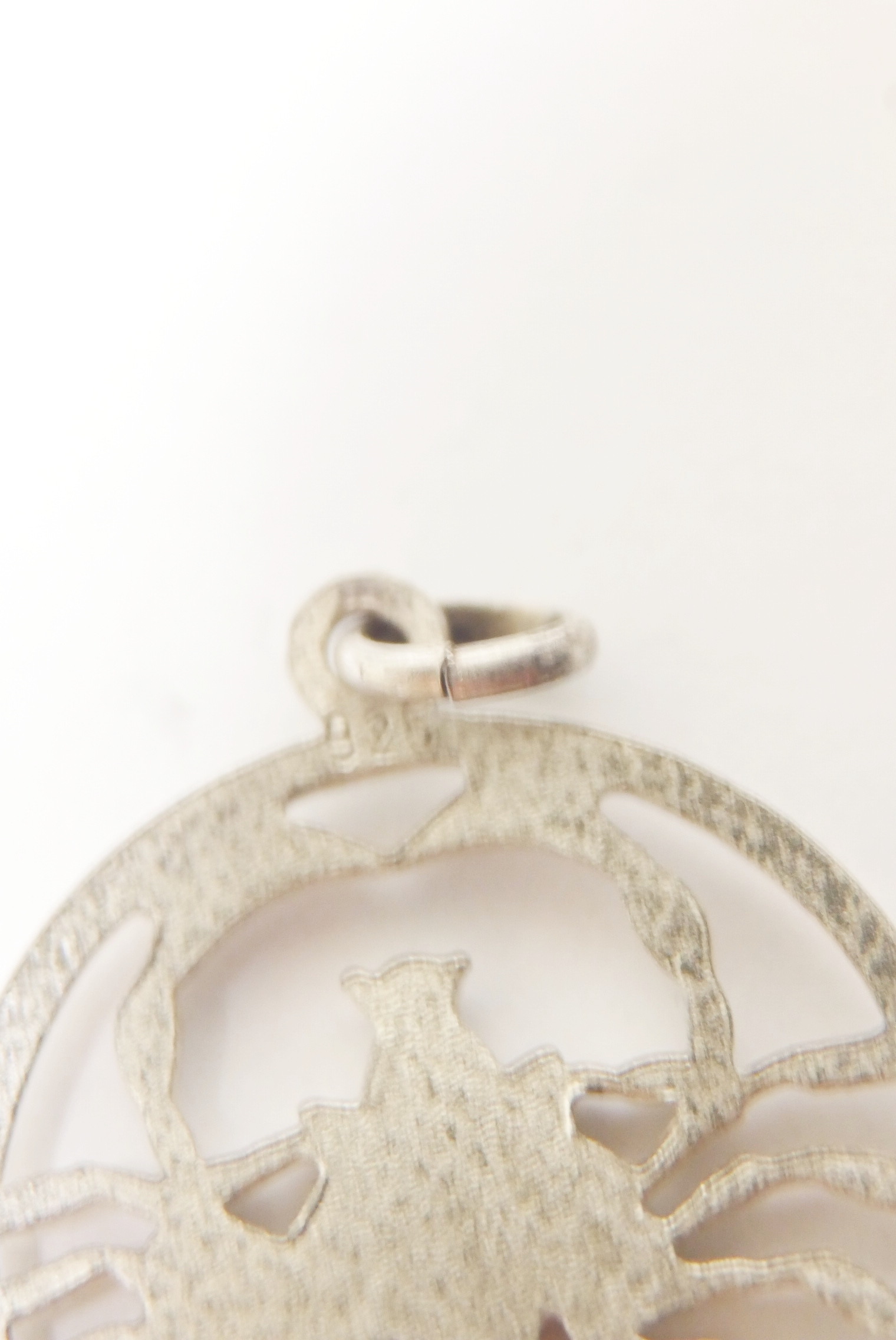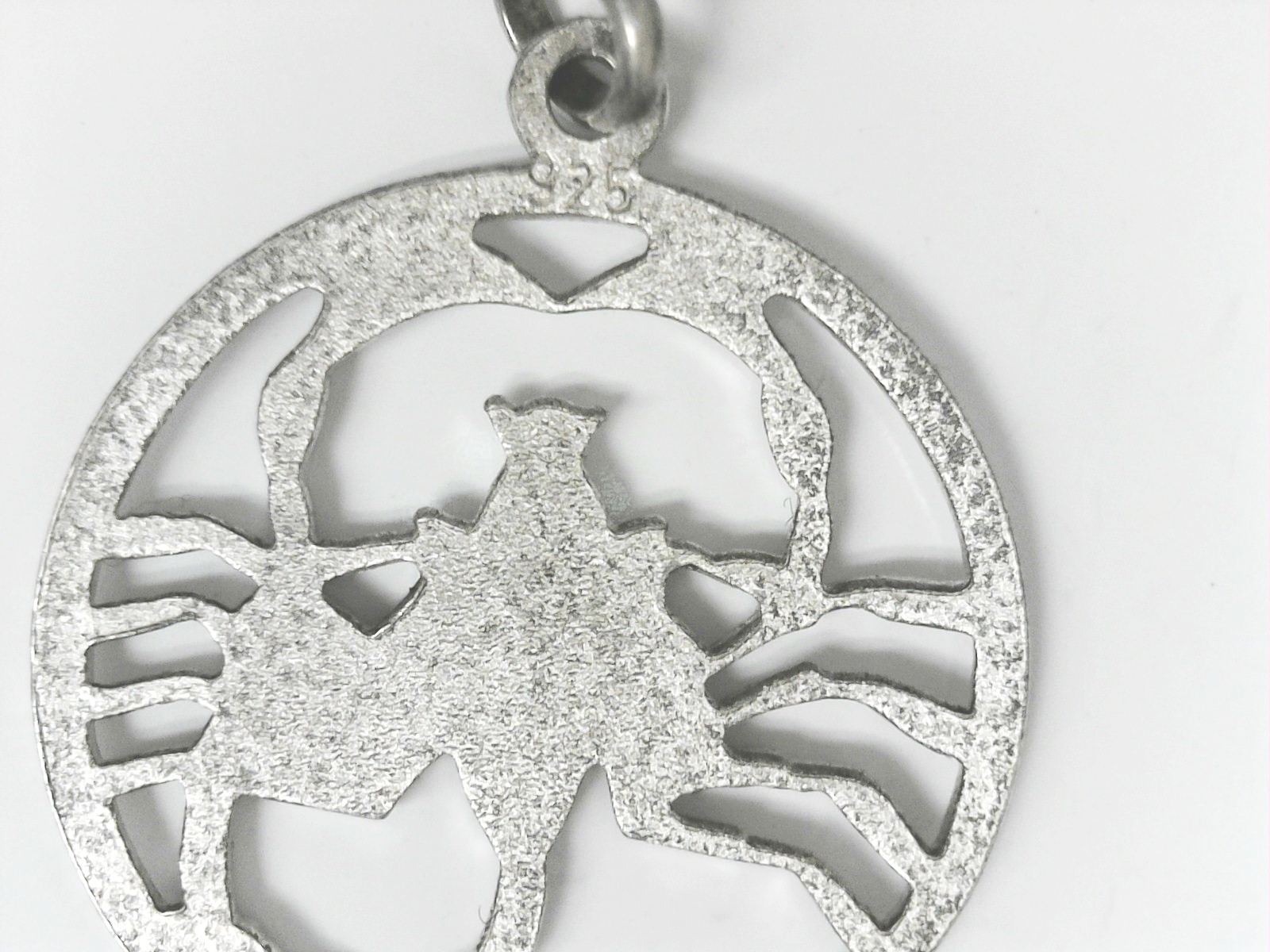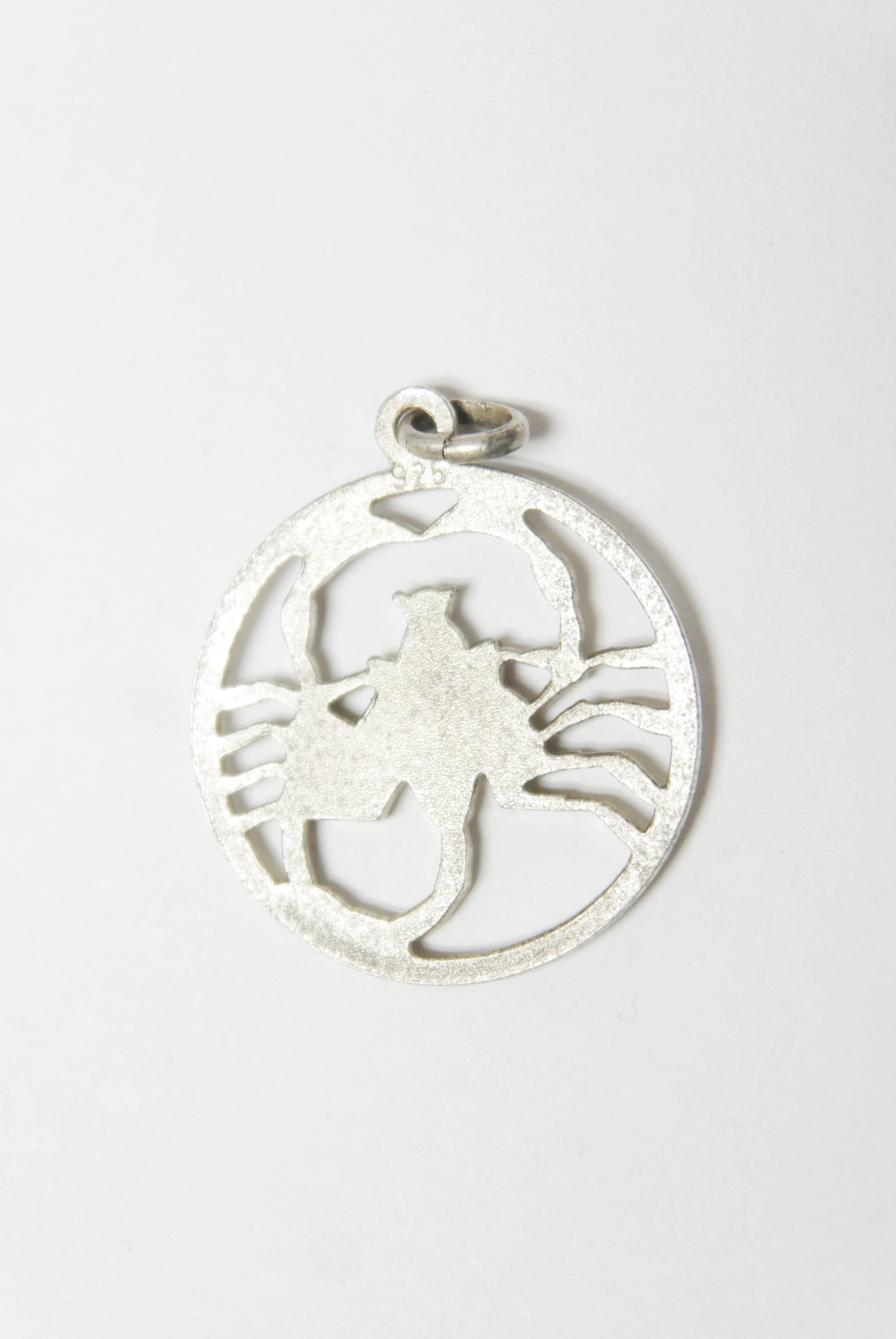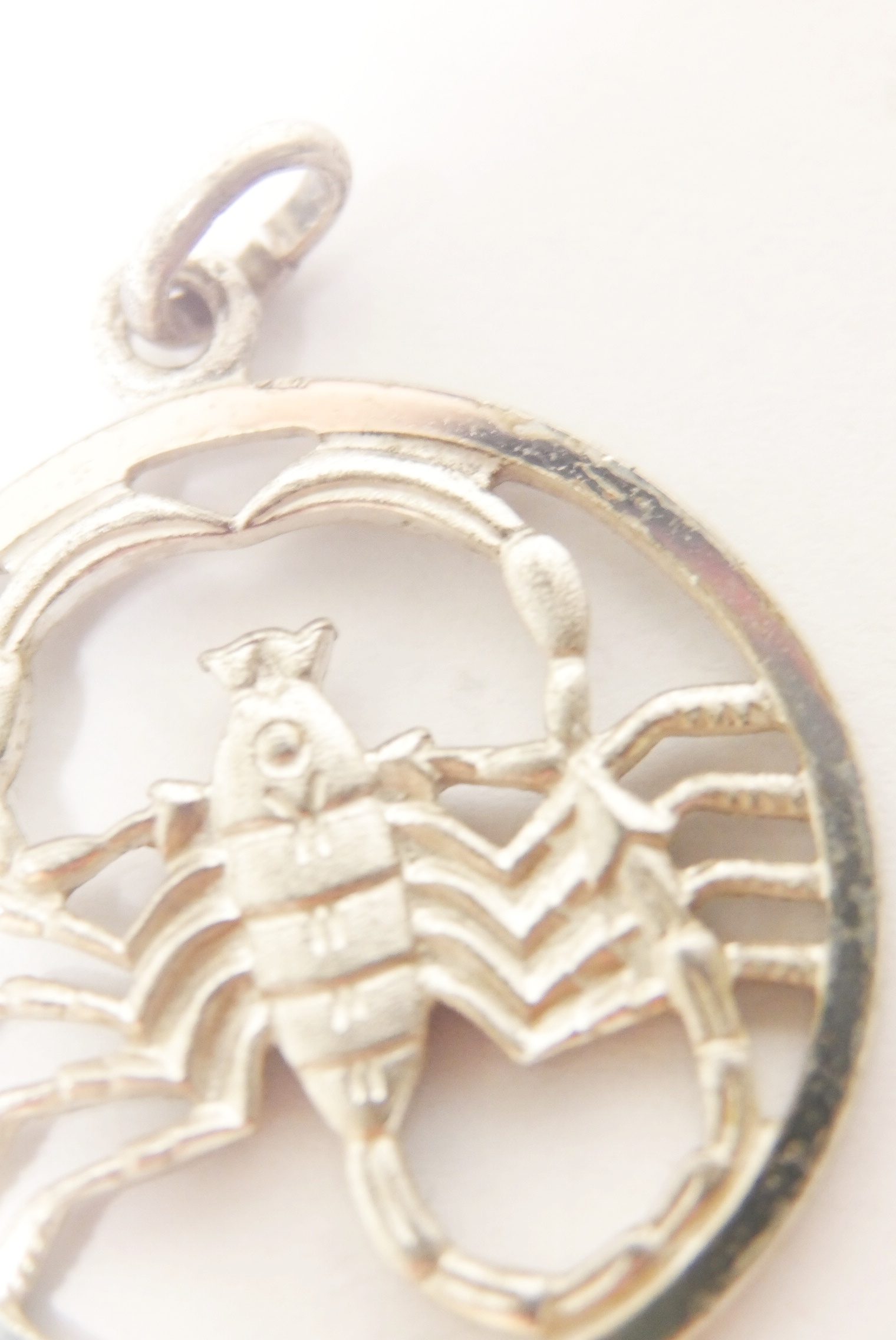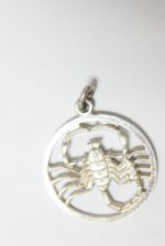 Dieser Anhänger aus Silber hat das Sternzeichen Skorpion. Der Anhänger ist rund und hat keinen Hintergrund.